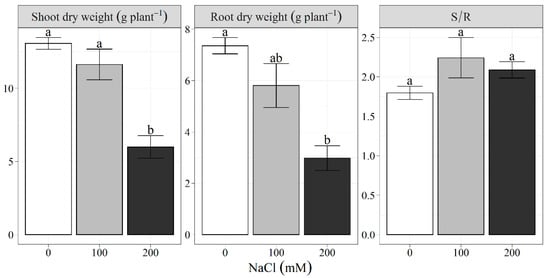 (Experiment 2) Shoot and root dry weights and their ratio (S/R) at 112 days after sowing of castor bean exposed to three salinity treatments (0, 100, and 200 mM NaCl). Data are means of three replicates ± standard errors. Bars followed by different letters differ significantly at p < 0.05.