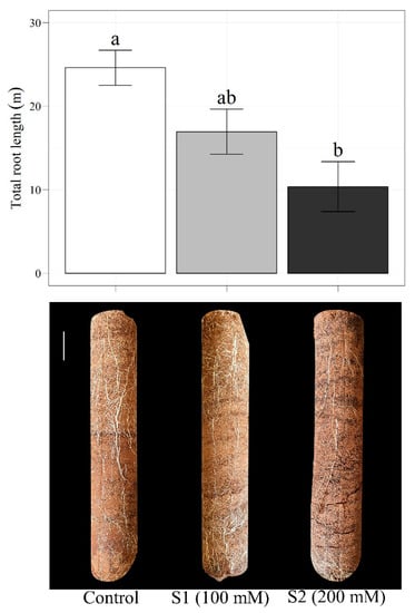 (Experiment 2) Total root length (upper) and soil columns with roots on the soil surface (lower) at 112 days after sowing of castor bean genotype Freo exposed to three salinity treatments (control, 0 mM NaCl; S1, 100 mM NaCl; S2, 200 mM NaCl). Data are means of three replicates ± standard errors. Bars followed by different letters differ significantly at p < 0.05. White bar denotes 10 cm scale.
