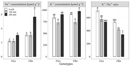 Genotypic differences between Zibo and Freo in response to salt stress could be explained further by Na+ and K+ distribution and K+/Na+ ratio in different plant organs. Significantly lower Na+ concentration in young leaves in Freo than in Zibo under high salinity level enhanced salt tolerance in Freo (Figure 9). Turner et al. [56] also reported that salt sensitivity in chickpea was strongly related to higher Na+ concentrations in young leaves and seeds, and limiting excessive Na+ accumulation in young tissues is important for salt tolerance in plants. The significantly higher K+/Na+ ratio in young leaves of Freo than Zibo could be responsible for the greater salt tolerance in Freo, as maintenance of a high K+/Na+ ratio in plant cytosol is an important factor for salt tolerance in plants [57]. Wang et al. [29] also reported that a salt-tolerant maize genotype maintained a higher K+/Na+ ratio than a salt-sensitive genotype.