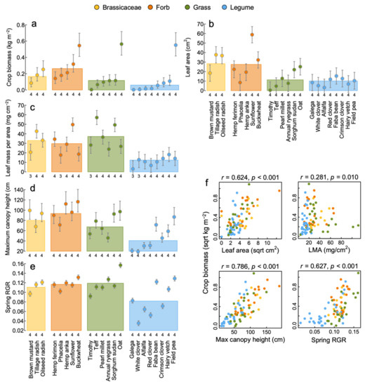 Crop aboveground biomass production (a) and the functional traits (b) leaf area, (c) leaf mass per area, (d) maximum canopy height and (e) spring relative growth rate (RGR). Points show means, and error bars are model estimates of standard errors for comparison among means of the crops. Numbers below each mean are the number of replicates included. The colored bars show the mean for each plant functional group (indicated by the different colors). Statistics are provided in Table 2. Significant correlations (Spearman) between crop biomass production and plant traits are shown (f). The association with rooting density is not shown as it was unrelated to crop biomass (r = 0.148, p = 0.169).