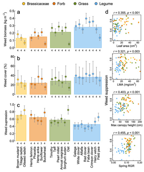 The biomass and cover of weeds varied significantly among plant functional groups and the identity of the crop (Table 2). The legumes resulted in the greatest, and the Brassicaceae and forbs the least, weed biomass (Figure 3a) and cover (Figure 3b). However, there was considerable variation among the crops with the Brassicaceae oilseed radish, the forb buckwheat, the grass oats, and the legume field pea having the lowest weed biomass and cover (Figure 3a,b). Consequently, weed suppression (the inverse of weed biomass and cover) also varied significantly among plant functional groups and the identity of the crops (Table 2) and was greatest in the Brassicaceae and lowest in the legumes with the greatest suppression with oilseed radish, buckwheat, oats, and field pea (Figure 3c). Weed suppression was positively correlated with greater leaf area, LMA, maximum canopy height and the spring RGR of the crops (Figure 3d).