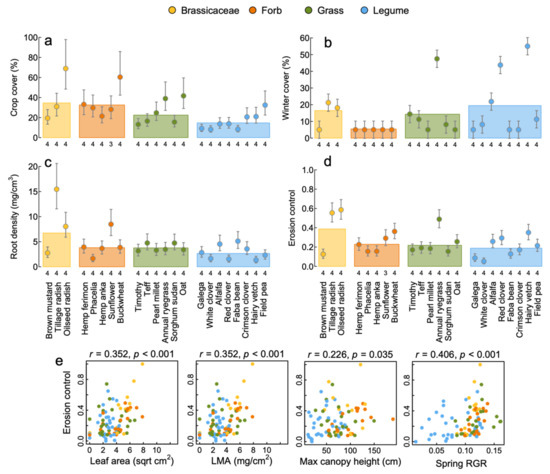 Erosion control. The average ground cover by crops (a), ground cover during the winter (b) and rooting density (c) and their scaled average used as the ecosystem service erosion control (d) are shown. Points show means, and error bars are model estimates of standard errors for comparison among means of the crops. The colored bars show overall means for each plant functional group (indicated by the different colors). Significant correlation (Spearman) between weed suppression and plant functional traits are shown in (e). Numbers below each mean are the number of replicates used. Statistics are provided in Table 2. Note, LMA = leaf mass per area and RGR = relative growth rate.