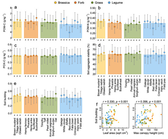 Soil building. Soil particulate organic matter carbon (POM-C) (a) and nitrogen (POM-N) (b), active carbon (POX-C) and (c) the percent soil aggregate stability (d) are shown. The scaled average of these are considered as the ecosystem service soil building (e). Points show means, and error bars are model estimates of standard errors for comparison among means of the crops. The colored bars show overall means for each plant functional group (indicated by the different colors). Numbers below each mean are the number of replicates used. Statistics are provided in Table 2. Significant correlation (Pearson’s) between soil building and plant functional traits are shown in (f). Note soil building was not correlated with leaf mass per area, spring relative growth rate or rooting density (r = −0.095, p = 0.392; r = 0.090, p = 0.403; r = −0.006, and p = 0.958 respectively).