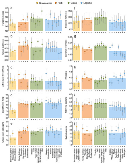 Bacterial richness and evenness both varied significantly among the crop functional groups (Table 2). Bacterial richness and evenness were greatest in soils conditioned by grasses and lowest in soils conditioned by legumes (Figure 6f,g). However, bacterial evenness also varied significantly among crops (Table 2). Of the legumes, galega, white clover and faba beans had the greatest bacterial evenness, which was similar to that of the grasses (Figure 6g). The abundance of rhizobia detected in the bulk soil varied significantly among both plant functional groups and individual crops (Table 2). Rhizobia were least abundant in the soils conditioned by the Brassica family and greatest in the forbs and legumes (Figure 6h). Specifically, field peas, crimson clover, red clover and alfalfa had the greatest abundance of Rhizobia, as well as the forb phacelia (Figure 6h). Nitrifying bacteria only varied significantly among plant functional groups, where grasses had the highest, and legumes the least, abundance of nitrifying bacteria (Table 2, Figure 6i). Cyanobacteria did not vary significantly among crops or their functional groups but were most abundant in soils conditioned by tillage radishes, oats, faba beans and hemp var. ferimon and least abundant in soils conditioned by buckwheat (Table 2, Figure 6e). Bacterial evenness was significantly correlated with greater LMA, while Rhizobia were marginally negatively associated with greater LMA in crops (Table 3). Cyanobacteria were significantly positively correlated with a greater rooting density (Table 3). All fungal indices were significantly positively correlated with each other, with the exception of AMF and plant pathogens, and all bacterial indices were positively correlated with each other, with the exception of rhizobia and Cyanobacteria (see Table S1 and Figure S1a). The averaging of the standardized values of these soil community indices as a measure of soil health varied significantly among crop functional groups (Table 2), where the brassicas scored the lowest for promoting soil health and grasses the highest (Figure S1b). Soil health was marginally associated with a greater rooting density (Table 3).