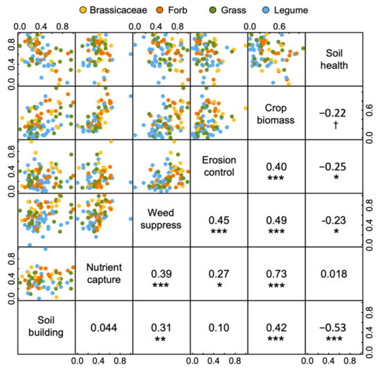 Our results show that nearly all agroecosystem services measured here could be related to cover crops with a more rapid, taller growth and larger leaf area. This, in turn, produced more biomass, generating a greater standing N and P and weed suppression, which is in line with previous studies showing that agroecosystem services are often a function of cover crop biomass production [11,12,13,14]. However, we also show that not all crops are equal in their ability to promote all ecosystem services, and while some crops may be ideal for promoting a specific agroecosystem service, it could result in a trade-off with another. For instance, legumes may be ideal as a green manure due to their high standing N and P content but are relatively poor at capturing soil NO3 and may promote potential plant fungal pathogens. Conversely, while members of the Brassicaceae family are particularly efficient at suppressing potential plant fungal pathogens, this may have undesirable effects on suppressing fungal saprophytic fungi and rhizobia for enhancing soil carbon and nutrient cycling. Thus, careful selection of the identity and functional traits of cover crops needs to be considered to target particular agroecosystem services. While different crops promote different ecosystem services, this may indicate that mixtures of species that differ in functional traits may complement each other to enhance particular agroecosystem services or enhance multiple ecosystem services simultaneously. However, whether mixtures of crops that are functionally different can enhance single or multiple ecosystem services through functional complementarity requires further detailed research, as competition among crops and lower densities of individual crops within mixtures may respectively interfere or dilute their abilities to enhance an ecosystem service.