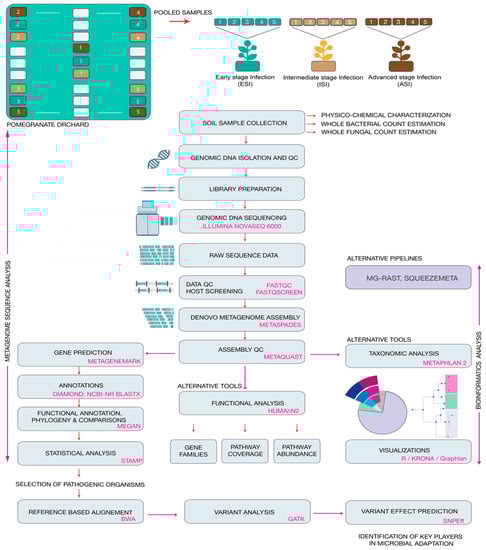 The present study involved screening the physiochemical parameters of the soil samples from the rhizosphere of the infected plants. The total microbial counts were estimated. Employing conventional microbiological methods the soil samples were plated on specialized media to confirm the presence of the pathogen Fusarium oxysporum and Aspergillus niger. Following which genomic DNA was isolated from soil samples and the quality control of the samples was performed. Whole metagenome shotgun sequencing was carried out. Thereafter, the data was subject to bioinformatics analysis to estimate the relative abundances of the microbes, and the functional predictions were performed. Finally, variant analysis was carried out to screening for possible targets that could provide key leads to understand the adaptations of the pathogen. An overview of the methodology adapted in the study is provided in Figure 1.