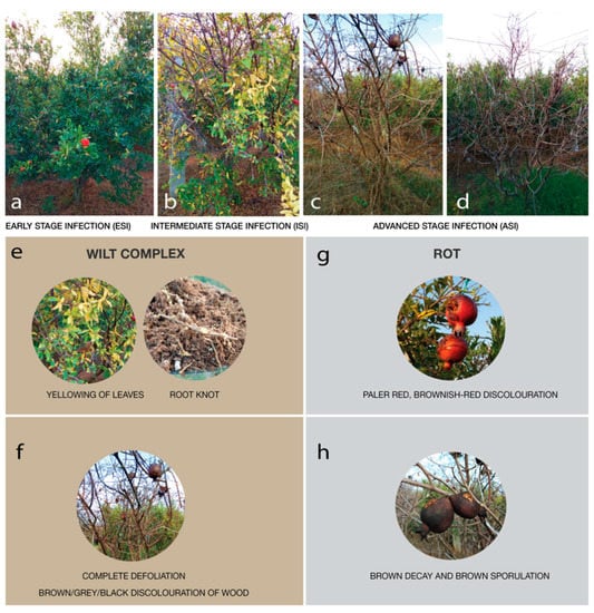 Physical symptoms of the plants, figures depict the physical symptoms of the infected plants—ESI; Early-stage infection, ISI; Intermediate stage infection, and ASI; Advanced stage infection (a–d). Other wilt-associated symptoms such as yellowing of leaves and root knots observed (e), rotting of fruit (g), complete defoliation (f), brown decay, and sporulation (h) observed are depicted.