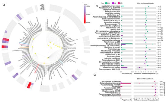 Microbial diversity and abundance. (a) The top-ranked microbes at the phylum level are depicted along with a comparison between ESI (blue) and ISI (purple); (b) and, ISI and ASI (pink); (c) depict the top-ranked microbes and the proportions and difference between the proportions with 95% confidence intervals along with the q-value (corrected) (q value < 0.001).