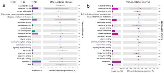 Pathway hits from InterPro2GO, databases. The top-ranked pathways are represented as per the color scheme—three samples ESI (blue), ISI (purple), and ASI (pink) (a). The top-ranked pathways are represented (a). A comparison between ESI (blue) and ISI (purple) (b) and, Significant hits represented show the top-ranked pathways along with the proportions and difference between the proportions with 95% confidence intervals considering a q-value (corrected) (p < 0.05).