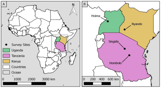 Selected study areas in East Africa (A) and survey sites in Kenya, Tanzania, and Uganda (B).