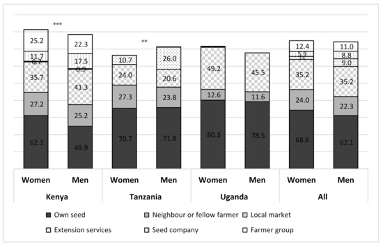 Seed sources, by country and sex (% of respondents). *** p < 0.01, ** p < 0.05 show significant association between respondent sex and seed source for that country using chi square tests.