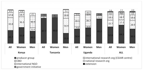 In Kenya and Uganda, farmers mention CGIAR Centres and affiliated initiatives (CIAT and CCAFS) as seed sources; however, a higher percentage of farmers in Kenya seem to have had more extensive access (Appendix A Figure A2). CCAFS has been working in the study communities that have been part of various projects, which has allowed farmers the freedom to access and use a broad variety of plant genetic material. More women (64.1%) compared to men (57.8%) mention access through producer organizations, which are mostly informal. On the other hand, men seem to use more formal seed sources, such as national and international research organizations—a significantly higher proportion of men in Kenya and Tanzania access these organizations (Appendix A Table A4). Community-based organizations are also mentioned as a seed source and a higher proportion of men compared to women use this source. CBOs are non-profit organizations that operate and provide social services (such as education, health, gender issues, rights of disabled, etc.) at the local level and rely mostly on voluntary contributions [49]. CBOs are generally smaller than NGOs, but larger than producer organizations, and can be important avenues for accessing markets, extension and finance [50]. None of the respondents mentioned the private sector in this section of the survey; no formal sources were mentioned because the leading question was on the organizations that farmers were involved in and they are not likely to be ‘involved’ in any private sector organizations, but are likely ‘access goods and services’ from such organizations.