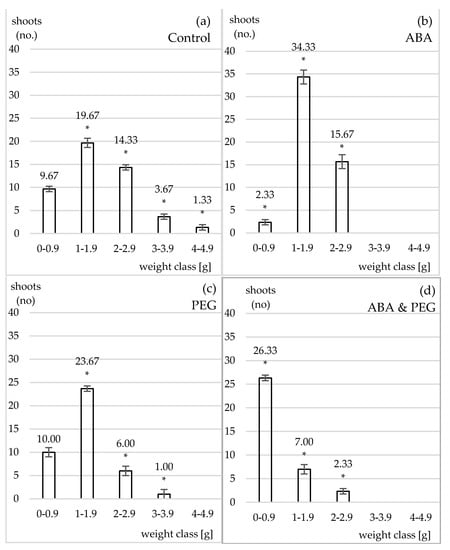 As a general remark control hypocotyls generated five classes of caulogenetic hypocotyls weighing between 0.5 and 4.8 g. As the number of developed shoots on each of explant significantly varied it was considered that it will be relevant to assess the shoot number per each class of weight. The first observation was that all the other experimented culture media (i.e., supplemented with ABA and/or PEG) do not generated the last weighing class and this may be connected to the activation of drought stress that was detrimental to morphogenetic processes to a certain extent (i.e., over 4 g). Thus, hypocotyls clearly developed shoots, their morphogenetic potential was not completely inhibited or arrested by supplementing culture media with ABA and/or PEG. At this stage it was needed to add cytokinin and auxin and this is in line with other authors because the morphogenetic potential implies complex processes such as dedifferentiation and redifferentiation as well as cell division and enlargement processes that are supported by a right balance between cytokinin and auxin [31,37].