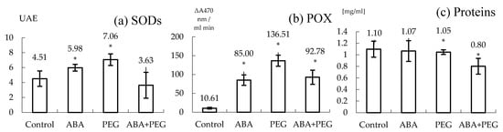 The effect of ABA and/or PEG on the SODs and POXs activities and on total protein content of the shooting hypocotyls in tobacco (N. tabacum L., ‘Baladi’). A significant increase was recorded for SODs activity when ABA and PEG were added into the culture medium (a); A significant increase of POX activity was recorded for ABA and/or PEG (b). Proteins were significantly decreased only under both stressor presence: ABA and PEG (c). * Significant differences: <0.05.