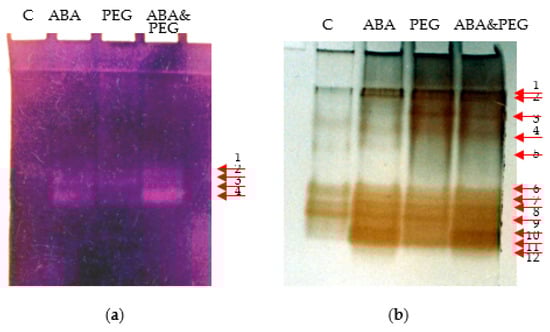 SODs (a) and POXs (b) isoforms revealed into electrophoretic gels of tobacco hypocotyls (N. tabacum L., “Baladi”) that have been submitted to the effect of ABA, PEG and ABA & PEG. In the right there are red arrows to emphasize the expression of isoforms after electrophoresis. C: control.