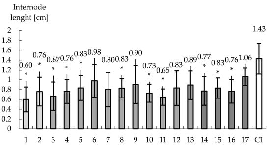 The evolution of internodes length for 18 tobacco clones studied and originating from hypocotyls that have been submitted to drought stress such as ABA (1 and 2), PEG (3–13), ABA & PEG (14–17). It is obvious the significant decrease in internodes length and in certain clones at half compared to control. * Significant differences: p < 0.05.