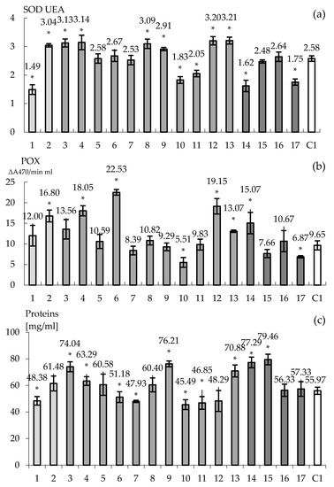 The effect of pre-treatment with ABA and/or PEG on activities of SODs (a), POXs (b) and total protein content (c) of the tobacco plantlets (N. tabacum L., ‘Baladi’) after 10 days of acclimatization. Significant differences: p < 0.05. The X axe is for evaluating all 17 clones and control C1. * Significant differences: p < 0.05.