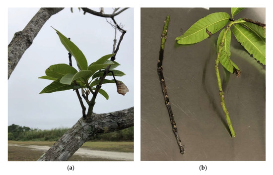 Mango tree with dieback caused by Neofusicoccum batangarum. (a) Few shoots and leaves remained on tree. (b) Necrotic and green shoots from affected tree.