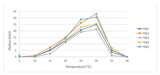 Temperature responses of five N. batangarum isolates (named Mg1–Mg5) were assessed to determine growth rate and ideal conditions. Maximum growth of all isolates was recorded at 30 °C, with mean radii ranging from 21.3 mm (±1.7 mm) to 33.1 mm (±0.6 mm) (Figure 3). No growth was observed at 5 °C or 40 °C, indicating these are below and above the cardinal temperatures of N. batangarum. Mg3 had the lowest growth at all temperatures tested.