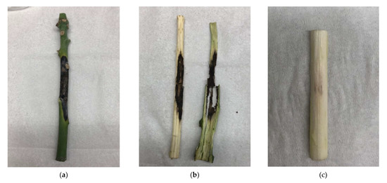 Wounded trees inoculated with the N. batangarum developed black necrotic lesions at 14 of the 15 inoculation points (93.3%). Removal of the bark showed necrosis in the xylem that was identical to the symptoms originally seen in the field-collected samples (Figure 4a,b). N. batangarum was re-isolated from all of these, thus fulfilling Koch’s postulates and confirming pathogen identity. No necrosis was observed in the negative controls.