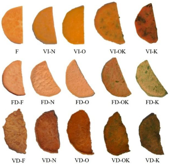 Control sample: fresh sweet potato (F), dried sweet potato by freeze drying (FD), vacuum drying (VD), sweet potato after VI with 2% NaCl solution (N), onion juice (O), kale juice (K), onion and kale juice (OK).
