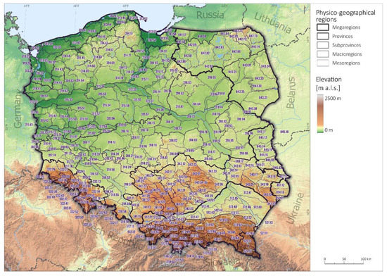 - Solon, J.; Borzyszkowski, J.; Bidłasik, M.; Richling, A.; Badora, K.; Balon, J.; Brzezińska-Wójcik, T.; Chabudziński, Ł.; Dobrowolski, R.; Grzegorczyk, I.; et al. Physico-geographical mesoregions of Poland: Verification and adjustment of boundaries on the basis of contemporary spatial data. Geogr. Pol. 2018, 91, 143–170. [Google Scholar] [CrossRef]