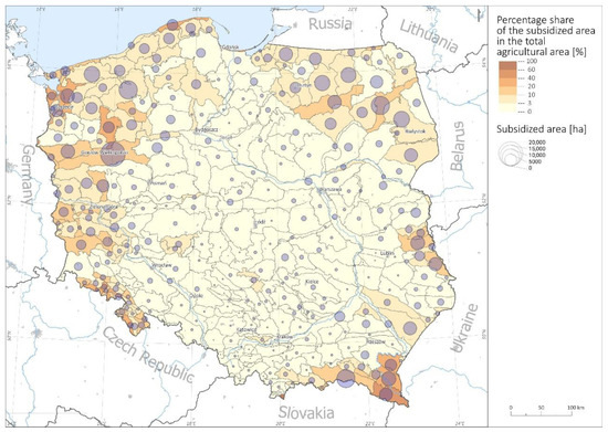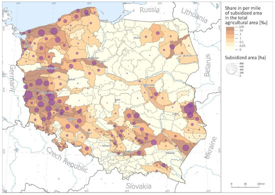 - –Percentage share of subsidised habitats in the total farm area (3.2% on average for Poland). Significant territorial differentiation was shown at the sub-province level—from less than 1% (Silesia-Kraków Upland and Lublin-Lviv Upland) to nearly 47% (Outer Eastern Carpathians), and more so by mesoregions—from 0.02% (Strzegom Hills and Racibórz Gate) to 58.3% (Bieszczady Mts) (Table 3, Figure 2);