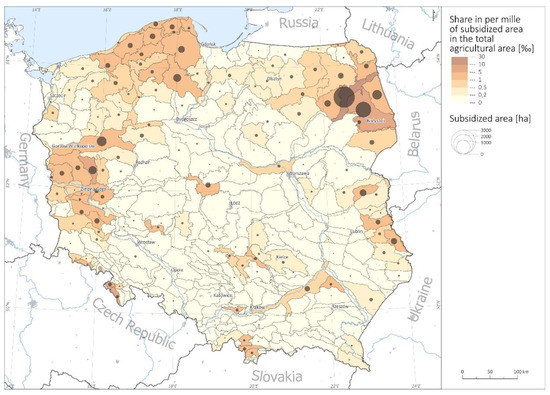 - –Percentage share of subsidised habitats in the total area of permanent grassland (average 11.8% for Poland). Significant territorial differentiation was shown at the sub-province level—from 2.1% (Silesia-Kraków Upland) to 50.5% (Outer Eastern Carpathians), and by mesoregions—from less than 0.1% (Reglowe Tatra Mts and Sub-Tatra Depression) to 72.9% (Toruń-Eberswalde Ice Marginal Valley) (Table 3, Figure 15).