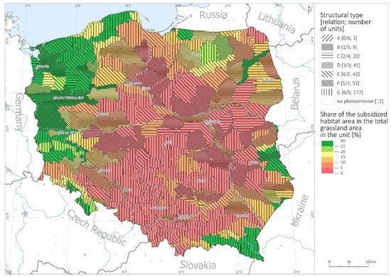 - E: P4, L2—low support for bird breeding habitats and high support for natural habitats; 42 mesoregions (typical of four sub-provinces, average relation for Poland), 12.2%;