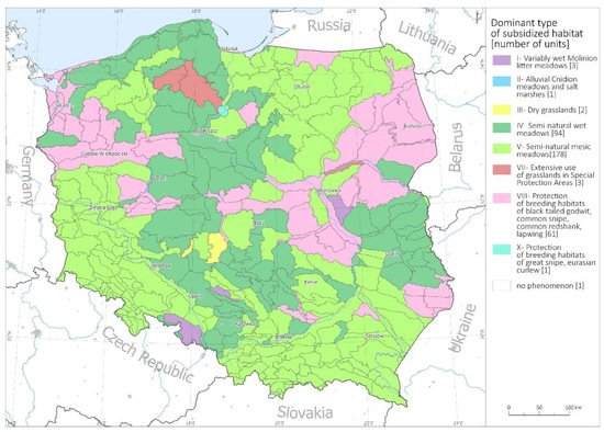 - V—Semi-natural mesic meadows—178 mesoregions, characterised by an average breakdown for Poland, and in eight sub-provinces mainly in north-eastern and south-western Poland as well as in the Carpathians and uplands;