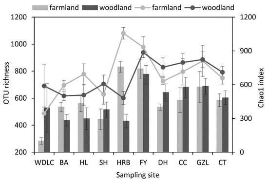OTU richness (represented by bar graph) and Chao1 index (represented by line chart) of the arbuscular mycorrhizal fungal community at 20 farmland and woodland sampling sites (WDLC, Wudalianchi; BA, Beian; HL, Hailun; SH, Suihua; HRB, Harbin; FY, Fuyu; DH, Dehui; CC, Changchun; GZL, Gongzhuling; and CT, Changtu). Values are mean ± standard error.