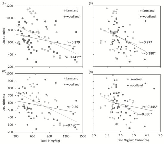 Relationship between arbuscular mycorrhizal fungal Chao1 index and total p or SOC (a,c) and OTU richness and total p or SOC (b,d) of the farmland and woodland sampling sites. * p < 0.05 and ** p < 0.01 by Turkey’s test.
