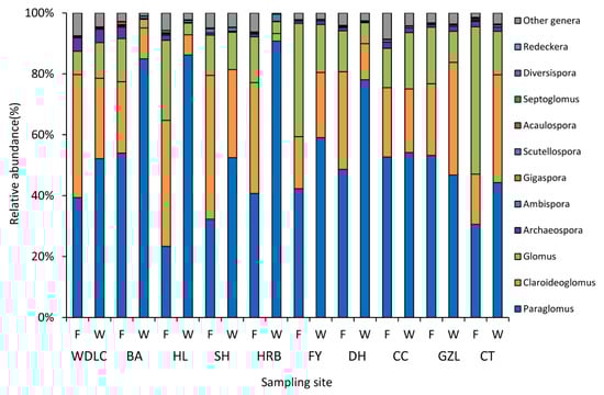 Relative abundance of the arbuscular mycorrhizal fungi genera at the 20 farmland or woodland sampling sites (WDLC, Wudalianchi; BA, Beian; HL, Hailun; SH, Suihua; HRB, Harbin; FY, Fuyu; DH, Dehui; CC, Changchun; GZL, Gongzhuling; and CT, Changtu). F and W represent farmland and woodland respectively.
