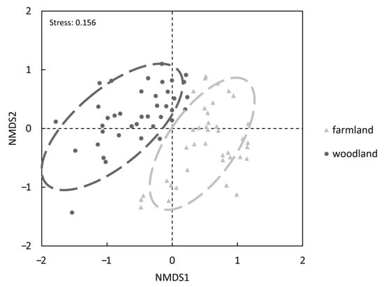 The NMDS analysis was performed to identify the differences in the AMF community composition between farmland and woodland (Figure 5). The stress value of 0.156 gave a good representation of the dissimilarity in AMF communities in farmland and woodland. PERMANOVA based on Bray-Curtis distance indicated that AMF community composition differed between farmland and woodland (F = 5.758, p < 0.001; Table 2).