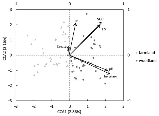 Canonical correspondence analysis (CCA) of the arbuscular mycorrhizal fungal community composition and edaphic factors of farmland and woodland. Edaphic factors include pH, soil organic carbon (SOC), total N (TN), total p (TP), urease activity and invertase activity.