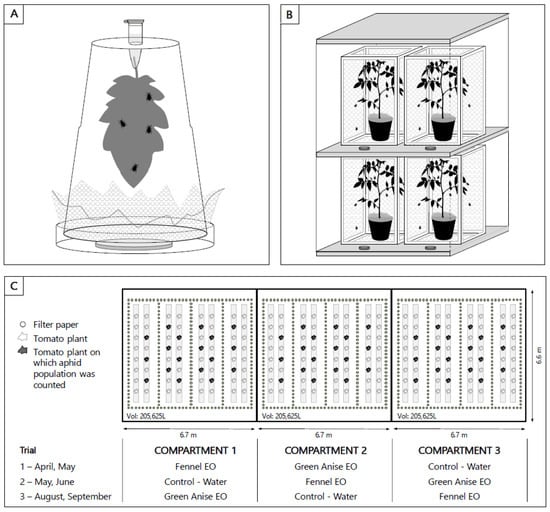 To determine whether the results of the laboratory experiments could be extrapolated to a more realistic agronomic scale, greenhouse experiments were performed to test the entomotoxic and phytotoxic effects of the two EOs. The greenhouse experiments were conducted in greenhouse compartments at the INRAE, Sophia Antipolis, France (compartment size: 44 m2, volume: 205,625 Lair, 24 ± 2 °C, 45 ± 15% RH, seasonal photoperiod). Each greenhouse compartment was submitted to one treatment: control/water, green anise EO or fennel EO. This experimental set-up was repeated three times in order to avoid a compartment effect as treatments were moving from one compartment to another in the different repetitions (Figure 1C). The three trials were carried out over the spring and summer seasons of 2019: Trial 1 took place from 15 April to 7 May, trial 2 from 20 May to 11 June and trial 3 from 12 August to 3 September.