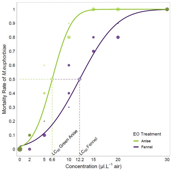 Dose-response curves for M. euphorbiae in response to increasing concentrations of green anise and fennel EOs (from 0 to 30 μl L−1air) applied by fumigation, and the subsequently calculated LC50 values. Control (no EOs) is shown by point (0;0).
