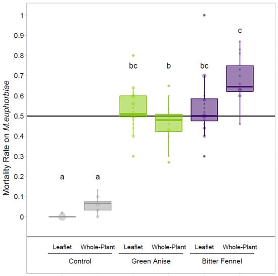 Mortality rate of M. euphorbiae in leaflet and whole-plant trials when exposed to the calculated LC50 values of green anise and fennel EOs. Different letters indicate significant differences between groups (X22 = 104.16, p < 0.001).