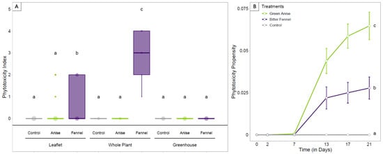 Recorded phytotoxicity on tomato plants in leaflet (A), whole-plant (A) and greenhouse experiments (B). (A): Phytotoxicity was assessed after 24 h of exposure to EOs. Different letters indicate significant differences between groups (X28 = 145.91, p < 0.001). (B): Phytotoxicity propensity dynamics over a 21-day period after application of 1.4 L of either green anise (LC50) or fennel EO (LC18) in greenhouse compartments, compared to a non-treated control compartment. Error bars indicate SE. Different letters indicate significant differences between groups (X22 = 135, p < 0.001).
