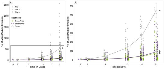 M. euphorbiae population dynamics over 21 days; number of M. euphorbiae individuals per tomato plant over a 21-day period after application of 1.4 L of either green anise (LC50) or fennel EO (LC18) in a greenhouse compartment, compared to a non-treated control compartment. Error bars indicate SE. Different shapes indicate different trials and colors illustrate the different treatments. Different letters indicate significant differences between groups (X22 = 140, p < 0.001). (B) is a zoom of graph (A).