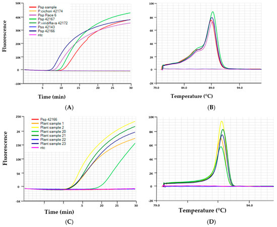 Results of LAMP assays shown as amplification curves (A,C) and melt curves (B,D) performed on Genie® III with representative samples. (A): The Psp LAMP assay generated positive amplification curves from Psp isolates VPRI 42166 (Race 3), VPRI 42167 (Race 6), Psp plant sample, and no amplification (depicted by a flat line) from isolates of Pss VPRI 42143, P. viridiflava VPRI 42172 and P. cichorii VPRI 42174. (B): Melt curves produced anneal derivative from the positive samples of Psp with a range of 89.6–90.1 which is indicative of a positive result for this assay. (C): The Pss LAMP assay generated positive amplification curves from Pss positive plant samples 1, 2, 20, 21 and 23 and no amplification from Psp 42166 and ntc. (D): Melt curves produced from the positive samples of Pss with an anneal derivative range of 90.1–90.7, which is indicative of a positive result for this assay.
