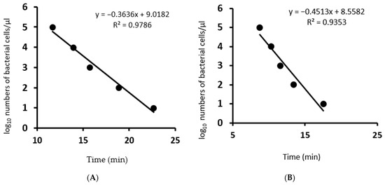 Regression curves generated in the LAMP assays for serial dilutions of live bacterial culture. Time to positive (Tp) is plotted against the log10 bacterial cells µL−1. (A): Pseudomonas syringae pathovar pisi primers, (B): Pseudomonas syringae pathovar syringae primers.