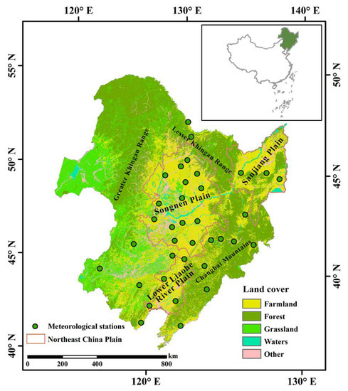NEC is located between 38.42 and 53.36° N and between 115.24 and 135.12° E, with a total area of 1.24 million km2. The land cover is dominated by farmland, forest, and grassland. The three major mountain ranges from west to east are the Greater Khingan Range, the Lesser Khingan Range, and the Changbai Mountains. The farmland in NEC is mainly distributed on the Northeast China Plain. This plain, one of only three black soil regions in the world, consists of the Sanjiang Plain, Songnen Plain, and lower Liaohe River Plain. The Northeast China Plain has a large, cultivated area and wide distribution, which is an important grain, soybean, and animal husbandry production base in China. The land area of NEC accounts for 8.2% of China, with the cultivated land area accounting for 13.3% of the national cultivated land area and the grain output accounting for 20.0% of China’s total grain output [29]. The climate of NEC is continental monsoon, and the average annual rainfall is 460 mm. Winter is long and cold–arid, while summer is short and warm. The annual average temperature of NEC is below 0 degrees. Additionally, NEC is one of the three stable snow cover regions in China. The snow cover period lasts from November to April of the following year. The region contains abundant snow resources and is of great significance for agricultural irrigation.