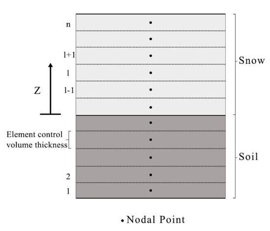 SNTHERM is a one-dimensional mass and energy balance model developed by the US Army Cold Regions Research and Engineering Laboratory (CRREL) to predict the temperature distribution of snow and frozen soil [33]. The model is intended for seasonal snow covers and addresses conditions found throughout the winter, from initial ground freezing in the fall to snow ablation in the spring. This model is suitable for the simulation of various winter meteorological conditions such as snowfall, sleet, rainfall, freeze–thaw cycles, and snow cover. Patankar’s volume control method is adopted in SNTHERM to subdivide the snow layer and the soil layer into horizontal infinite layers (each layer is considered as a node) to obtain numerical solutions (Figure 2), each of which conforms to energy-conservation equation and mass-conservation equation [34,35].