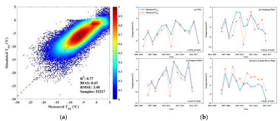 The SNTHERM model performances are shown Table 1. We firstly used simulated TSS of 36 weather stations from 2005 to 2018 with a three-hour step. In order to match the measured TSS, we process the simulated TSS into the daily average TSS and verify the accuracy of the simulated data and the measured data at the site. Figure 3a shows the scatterplots of the measured daily average Tss and model simulation results of 36 farmland weather stations from 2005 to 2018. The overall BIAS value is 0.43 °C, and RMSE value is 3.48 °C. In most stations, the BIAS of the simulated TSS is higher than that of in situ observations, with BIAS ranging from −2.32 to 1.65 °C. Our results also indicate non-significant relationships between snow depth and the simulation accuracy of TSS, while the accuracy of TSS is more affected by land cover type. The larger RMSE values are mainly concentrated in regions with mixed pixels, where land cover is predominantly forest and grassland with less farmland. The model has a good performance in other regions (mainly concentrated in the Sanjiang Plain, Songnen Plain, and lower Liaohe River Plain), where the underlying surface is homogeneous farmland and is less affected by other factors. There are many positive TSS in both simulations and observations in Figure 3a, which mainly concentrated during periods of snow ablation. When the snow cover is melting, the TSS will remain at about 0 °C, and more than freezing point occurs which leads to soil cooling. The calculation results of the Pearson correlation coefficient show that the trends of year-to-year fluctuations between the model and the actual measurement are consistent during 2005 to 2018 (Figure 3b). The improved SNTHERM model has a superior applicability in NEC and can simulate the trend of TSS in the Northeast.