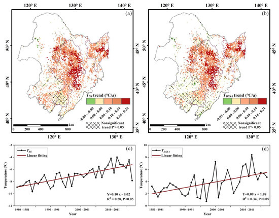 (a,b) are the linear trend of the annual average TSS and TDSSA at each grid from 1979 to 2018, respectively. (c,d) are the linear trend of the annual average TSS and TDSSA in all farmland in NEC from 1979 to 2018. The solid lines in (c,d) denote the linear regression trend over the period 1979–2018.