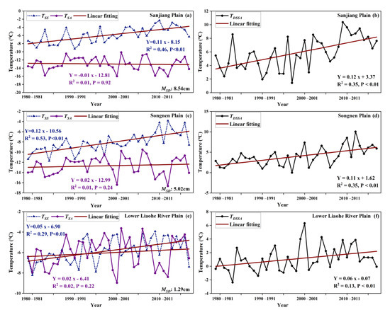 Deep snow has better thermal insulation effects on the ground in the Sanjiang Plain (R2 = 0.35, p < 0.01, Figure 4b). Therefore, although TSA non-significant decreased from 1979 to 2018 (R2 = 0.01, p = 0.92), TSS still exhibited a rapid increasing trend in the Sanjiang Plain (R2 = 0.46, p < 0.01, Figure 4a). Although TSS and TSA of the Songnen Plain are increasing rapidly, TDSSA still increased rapidly (R2 = 0.35, p < 0.01, Figure 4d), the changes of TSS are less affected by TSA accordingly. In the lower Liaohe River Plain, TSS and TDSSA both increased at a slow rate (TSS: R2 = 0.29, p < 0.01; TDSSA: R2 = 0.13, p < 0.01; Figure 5e,f).We also found snow cover has a very weak thermal insulation effect on the ground and even has a cooling effect at certain times due to the shallow snow.