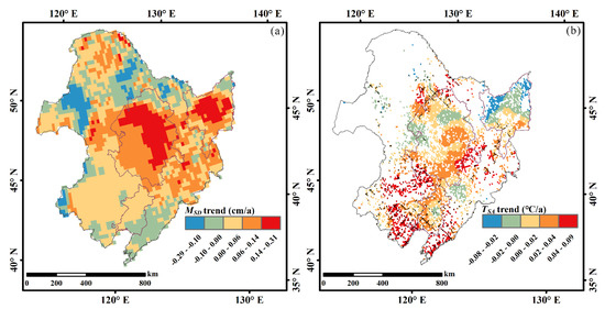 The results show that TSA and TSS have a widespread negative correlation. For example, in the Songnen Plain and some parts of the Sanjiang Plain, TSS unexpectedly exhibits an increasing trend when TSA decreases (Figure 4a and Figure 6b). Therefore, we analyzed the relative importance of TSA and MSD to the change in TSS in each pixel (Figure 7, Table 3) according to the approach of Zhu et al. [36]. The results show that MSD was more important to the change of TSS; with increasing MSD, TSS also increased, especially in the Sanjiang Plain (95% of increasing TSS) and Songnen Plain (99% of increasing TSS). At the same time, TSS and TDSSA in these regions underwent rapid growth (0.06–0.22 °C/a, Figure 4a,b). The main reason for this is that the significant influence of the rapid increase of MSD (0.06–0.31 cm/a) counteracts the negative effect of the decrease in TSA on TSS, which makes TSS and TDSSA experience a rapid increasing trend (Figure 4 and Figure 7c). There is a stronger correlation between TSS and TSA in part of the lower Liaohe River Plain (Table 3). When a decrease in MSD co–occurred with an increase in TSA, an increase of TSS was observed. The pixels for which increasing TSA had a stronger effect on TSS offset the slow decrease of MSD, causing the TSS to increase at a slower rate in these areas (0.00–0.06 °C/a, Figure 4a, Figure 6, and Figure 7c). Moreover, for the pixels in the northwest of NEC and the southern coast of NEC, approximately 1% of TSS decreased between 1979 and 2018 (Figure 4a), where the decrease of MSD and TSA simultaneously appears.