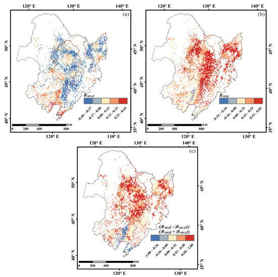 We selected MSD and TSA as explanatory variables and calculated the correlation coefficient between TSS and TSA as well as MSD to analyze the factors that cause TSS to change at the grid–scale (Figure 6). The majority of pixels (83%) exhibited a positive trend of MSD in farmland, with a faster growth trend (0.06–0.31 cm/a) in the northeast of NEC (mainly the Songnen Plain and Sanjiang Plain). We observed a decreasing trend in MSD in the southeast (including Parts of the Lower Liaohe River Plain), north (mainly forest), and west (mainly grassland) of NEC (Figure 6a). The long-term change of TSA in farmland of NEC is complicated; however, the majority of pixels (78%) show an increasing trend. As shown in Figure 6b, the areas with a rapid increase of TSA are mainly concentrated in the southern coastal area of NEC and the southeast and southwest of the Songnen Plain (0.04–0.09 °C/a). In the middle of the Songnen Plain and the northern Sanjiang Plain, TSA had a decreasing trend, especially in parts of the Sanjiang Plain, where a rapid decline of TSA was observed (−0.08–−0.02 °C/a).