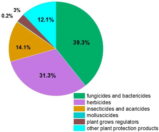 Categories of pesticide sales in the European Union in 2019 (adaptation from Eurostat Pesticide, http://appsso.eurostat.ec.europa.eu/nui/submitViewTableAction.do, accessed on 8 April 2021).